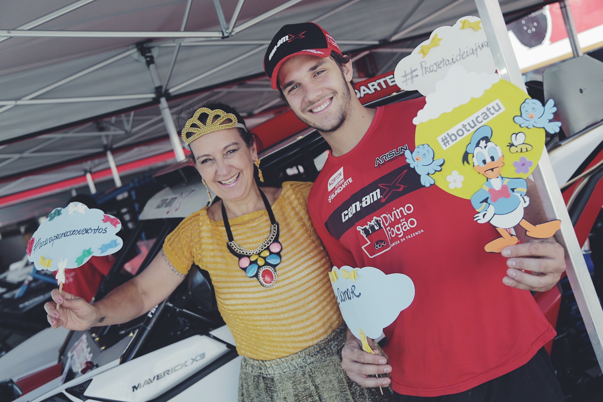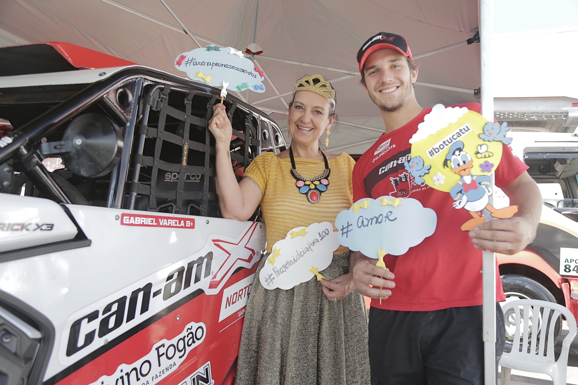 Nos boxes do Rally Cuesta Off Road, atual campeão brasileiro de Rally Baja e do Rally dos Sertões na categoria UTVs (Can-Am Maverick X3), Bruno Varela, de 21 anos, aproveitou os momentos de folga para fazer fotos junto à personagem Patrocínia que encantou as crianças durante a ação.