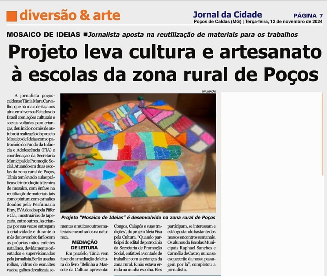 O Projeto Mosaico de Ideias tinha como objetivo geral proporcionar às crianças moradoras da Zona Rural de Poços, de forma lúdica, momentos de aprendizado com técnicas de pintura, mosaico, colagem e outras, no período do contraturno escolar.