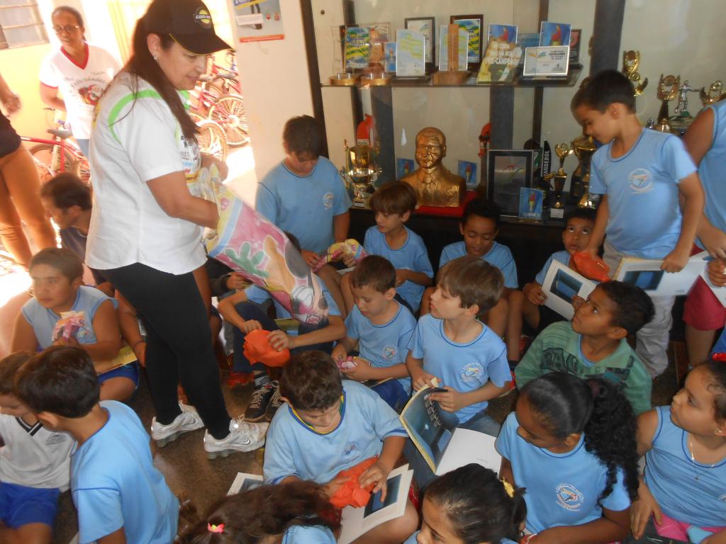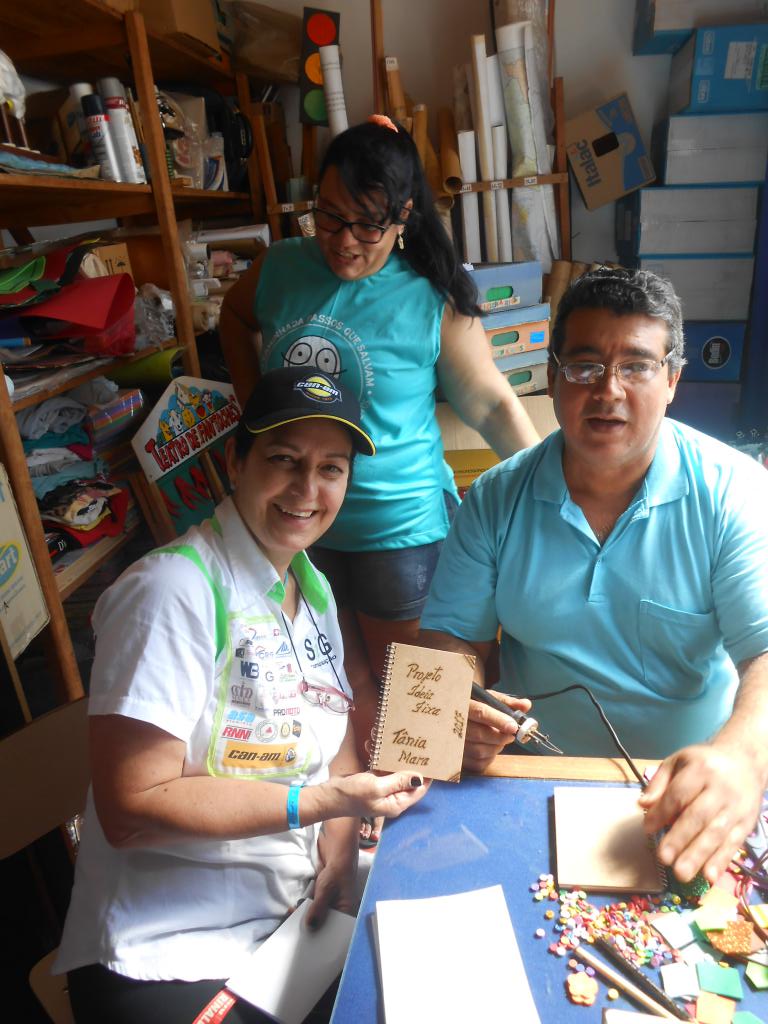 Contamos um pouco sobre nosso trabalho, distribuímos os bichos de pelúcia e fomos surpreendidas com o ato do Sr. Zézinho que com muita habilidade gravou em cadernetas o nome do Projeto e o nosso, com um pirógrafo e nos presenteou. Ele nos contou também que desde de 2015 criou um projeto que recolhe pilhas e baterias de celular. Com as crianças eles os troca por lápis, incentivando o descarte consciente!