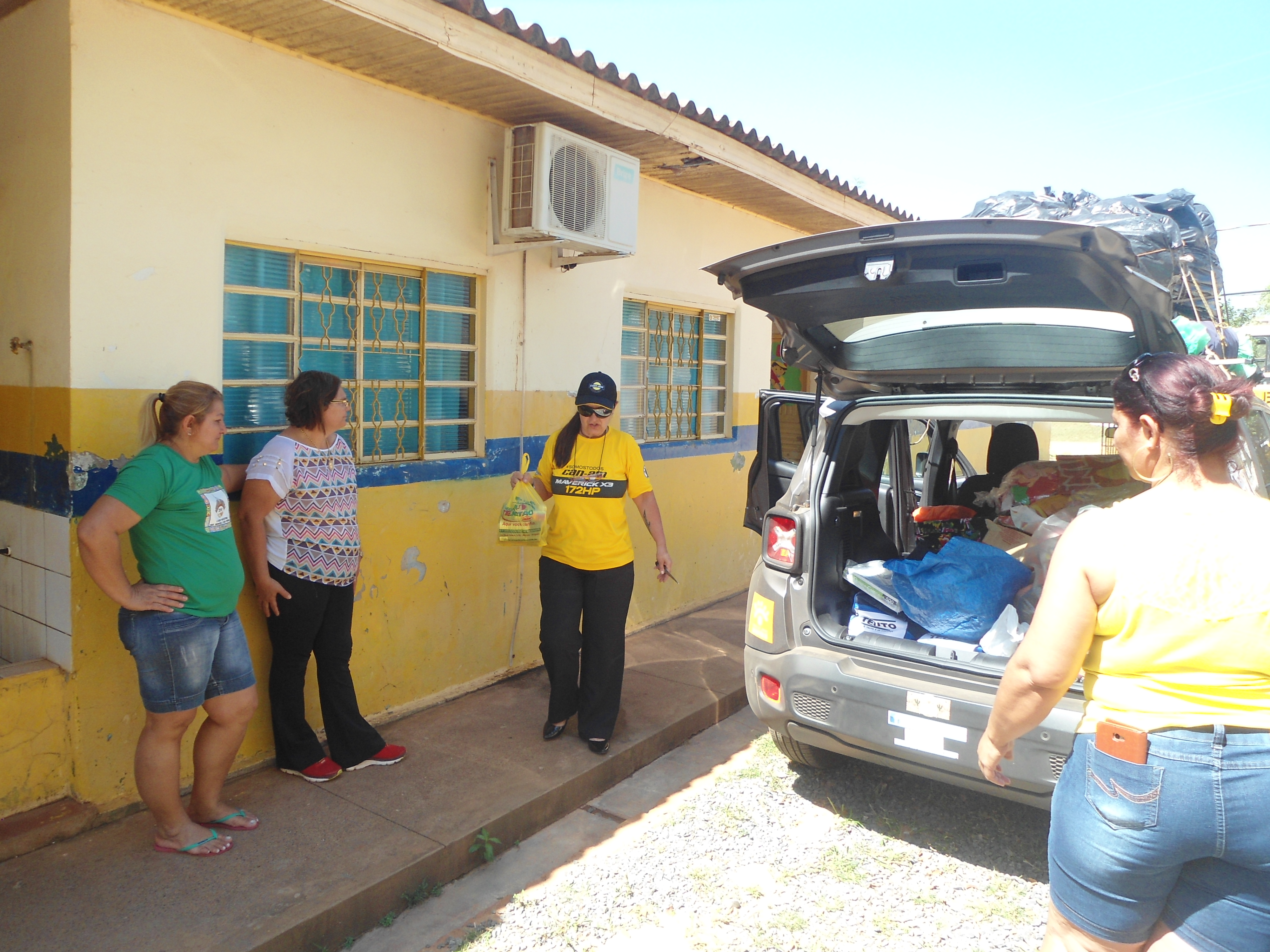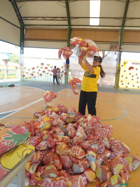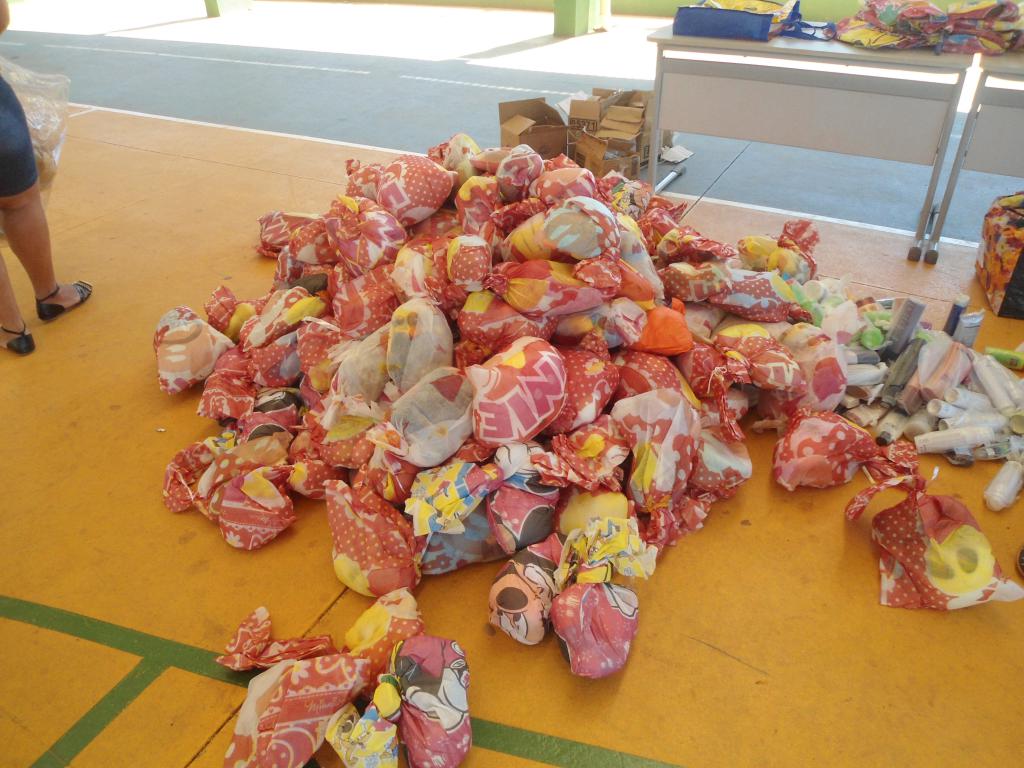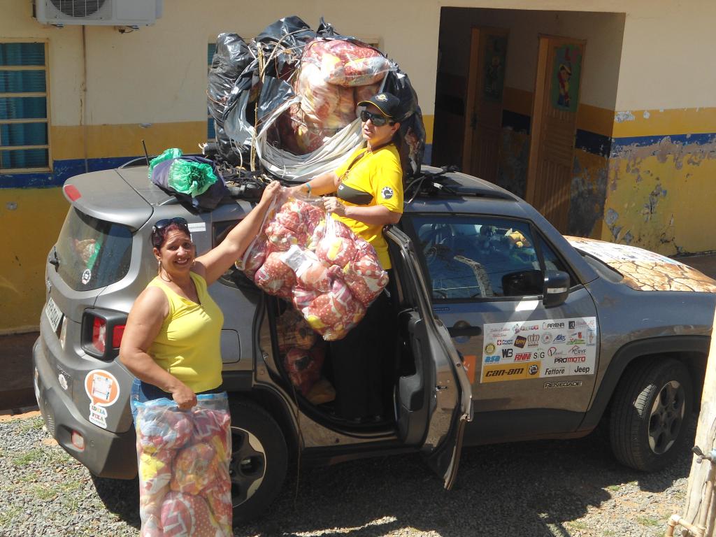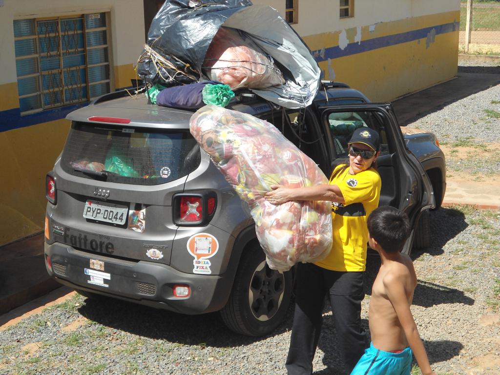 Era hora de descarregar uma das maiores cargas que trouxemos e organizar aquele tanto de kits que seriam doados e assim foi feito. As professoras colaboram e logo tudo estava prontinho!