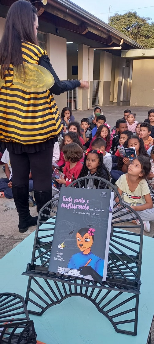 Porém foi na parte da tarde que o evento se tornou ainda mais dinâmico e envolvente. A abelha Belinha, personagem interpretado por Tânia, “pousou” no pátio central da escola. Arrancando elogios e trocando experiências com os pequenos.